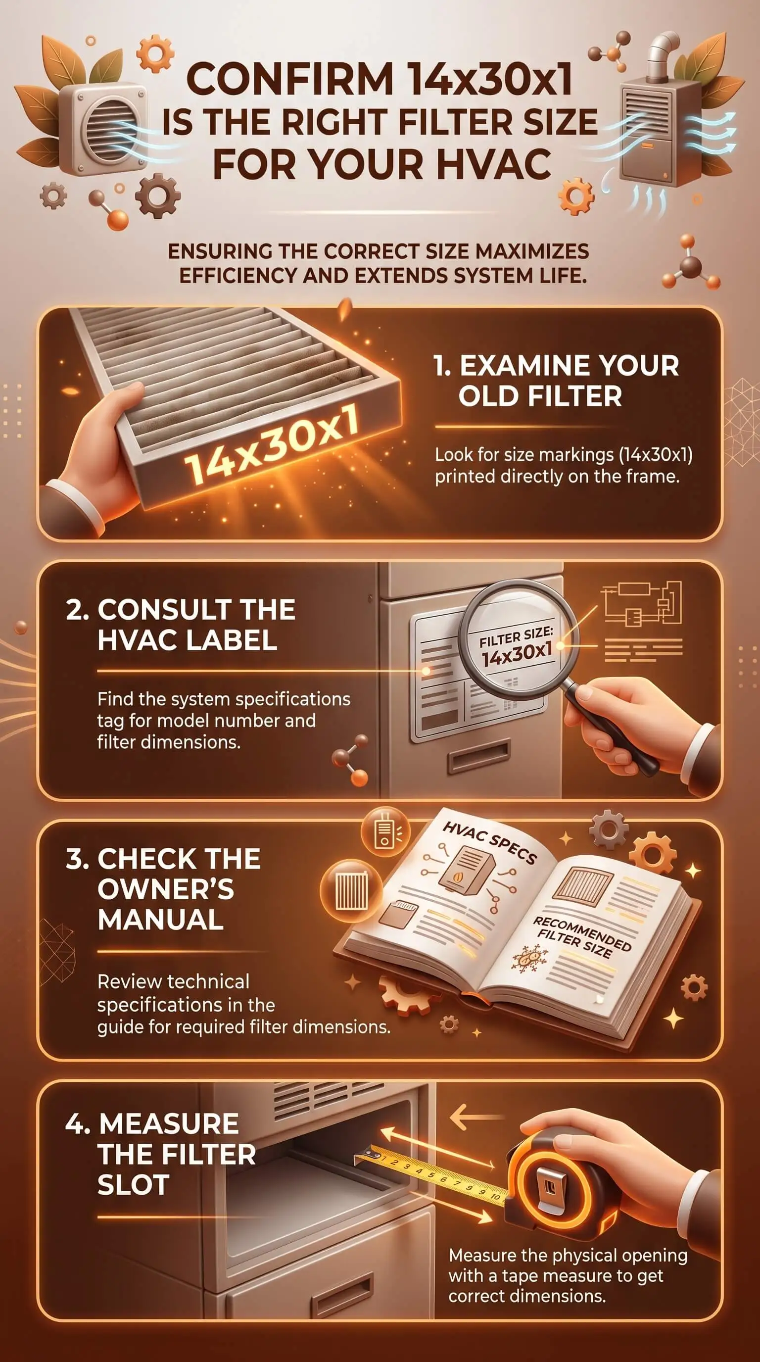 The size printed on your old filter is not always the size your HVAC system was built to take. A previous owner or contractor may have forced the wrong filter into the slot. To confirm 14x30x1 is your size, measure the interior of the filter slot itself with a tape measure. If it falls within 13.5" to 14" wide, 29.5" to 30" long, and 0.75" to 1" deep, 14x30x1 is correct.
